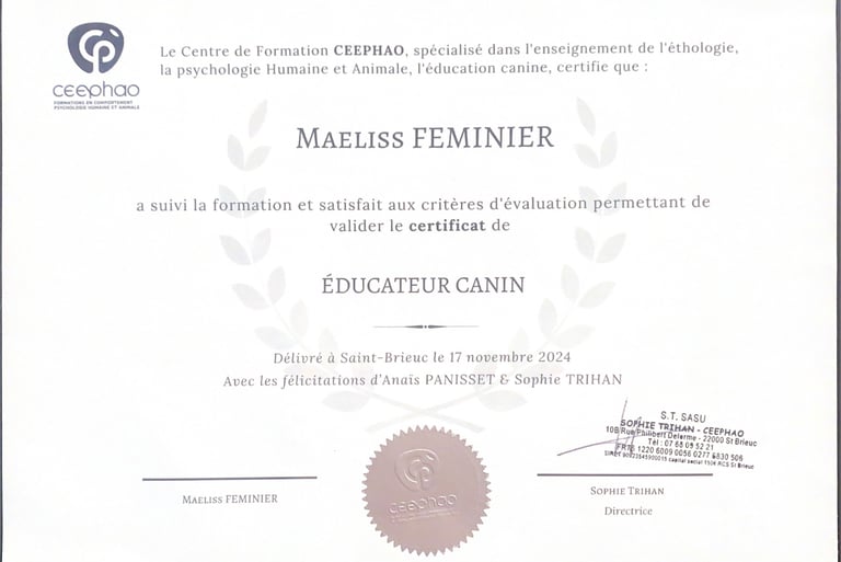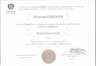 Depuis mon plus jeune âge, j'ai grandi entourée d'animaux, une expérience qui a profondément façonné ma vision du monde et ma compréhension des êtres vivants. Cette proximité m'a appris à observer, écouter et comprendre les besoins des animaux, bien avant de connaître les termes techniques de l'éducation canine.